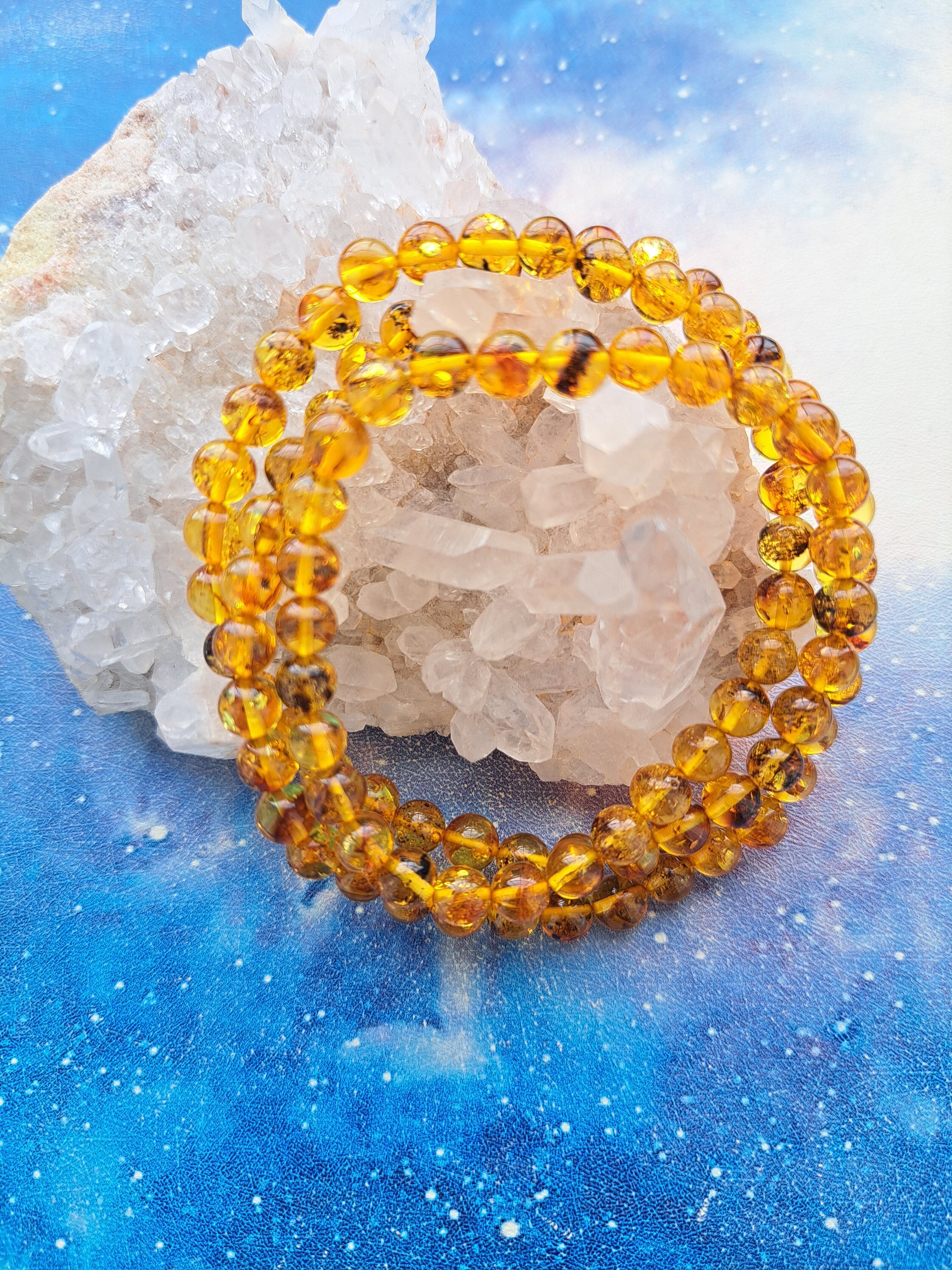 美しい琥珀は、その独特の色合いと温かみのある質感が特徴。琥珀は心を穏やかにし、ストレスを和らげる力を持つと言われています。